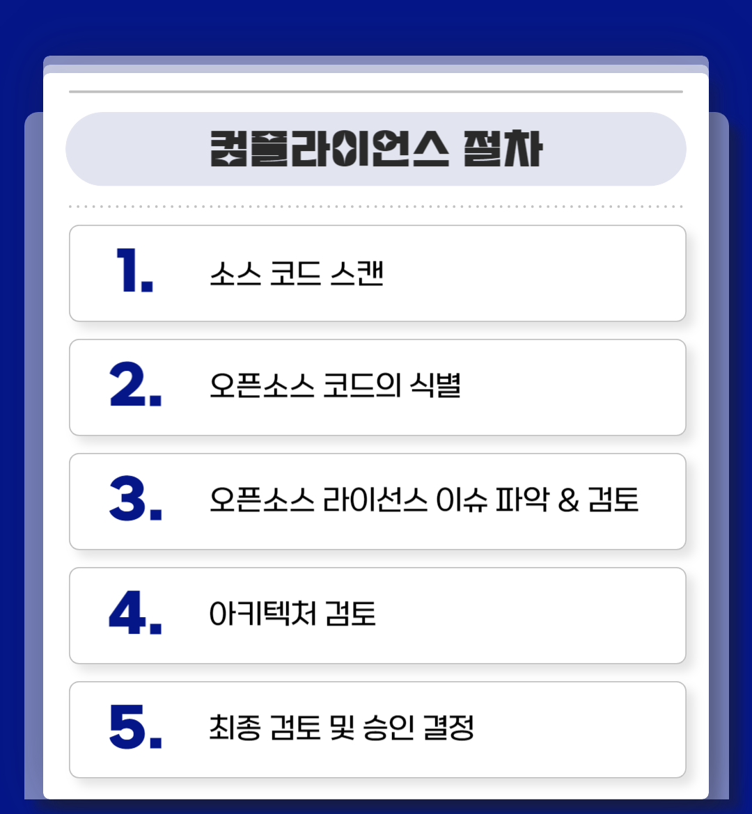 오픈소스 컴플라이언스 절차는 기업의 사정과 분야에 따라 차이가 있지만 리눅스 재단에서 공표한 ‘오픈소스 확인 및 검토 5단계 컴플라이언스 절차’에 따라 다섯 가지 단계로 나눌 수 있습니다.