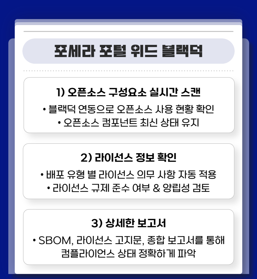 엘에스웨어의 포세라 포털 위드 블랙덕은 오픈소스 컴플라이언스의 필수 요소인 오픈소스 식별부터 컴포넌트 점검, 라이선스 관리의 A to Z를 담당하고 있습니다.