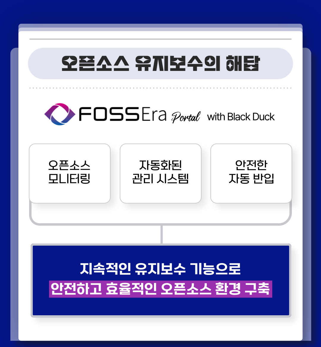 오늘은 오픈소스 유지보수에 대한 이야기를 준비했습니다. 오픈소스 사용 시 유지보수가 필요한 이유, 포세라 포털 위드 블랙덕의 효율적인 오픈소스 유지보수 시스템에 대해 소개합니다.